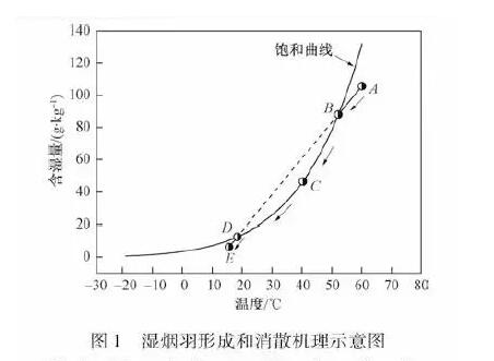 假定“白煙”在煙囪出口的狀態(tài)點(diǎn)為A,環(huán)境空氣的狀態(tài)點(diǎn)為E,“白煙”和環(huán)境空氣的含濕量均小于相應(yīng)溫度下的飽和含濕量,即“白煙”與環(huán)境空氣的相對(duì)含濕量均小于100%,處于未飽和狀態(tài)。“白煙”由煙囪排出與環(huán)境空氣混合過(guò)程中,“白煙”的狀態(tài)點(diǎn)開(kāi)始沿線變化,達(dá)到B點(diǎn)后“白煙”變?yōu)轱柡蜖顟B(tài)。飽和“白煙”與環(huán)境空氣混合過(guò)程中“白煙”的狀態(tài)點(diǎn)沿著飽和曲線BCD變化,隨著“白煙”溫度的降低,飽和“白煙”的絕對(duì)含濕量降低,“白煙”中過(guò)飽和的水蒸氣凝結(jié)成液態(tài)小水滴,小水滴對(duì)光線產(chǎn)生折射、散射作用,從而使煙囪出口的煙羽呈現(xiàn)白色或者灰色,形成“白煙”。當(dāng)飽和“白煙”的狀態(tài)點(diǎn)達(dá)到D點(diǎn)后,“白煙”與環(huán)境空氣的混合過(guò)程沿著撕線變化,“白煙”變?yōu)榉秋柡蜖顟B(tài),“白煙”中不再有小液滴凝結(jié)、析出,同時(shí)“白煙”中的小液滴開(kāi)始蒸發(fā),“白煙”逐漸消失。
